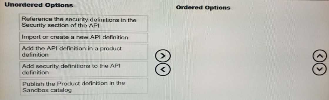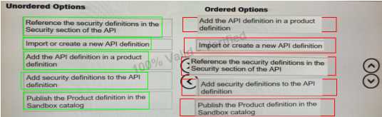 DRAG DROP A new proxy API needs to be created, security added, and published to the Sandbox catalog. Which is the correct sequence of steps that should be taken to perform these tasks?