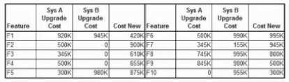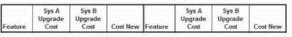 table in the image to calculate the total cost of upgrading or creating new features for each system,