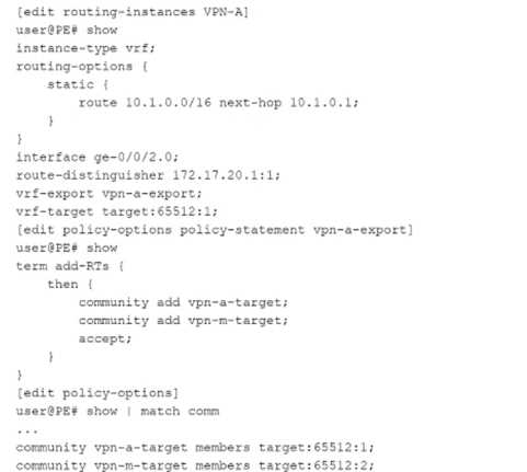 The vpn-a-export policy explicitly adds both vpn-a-target (65512:1) and vpn-m-target (65512:2) to