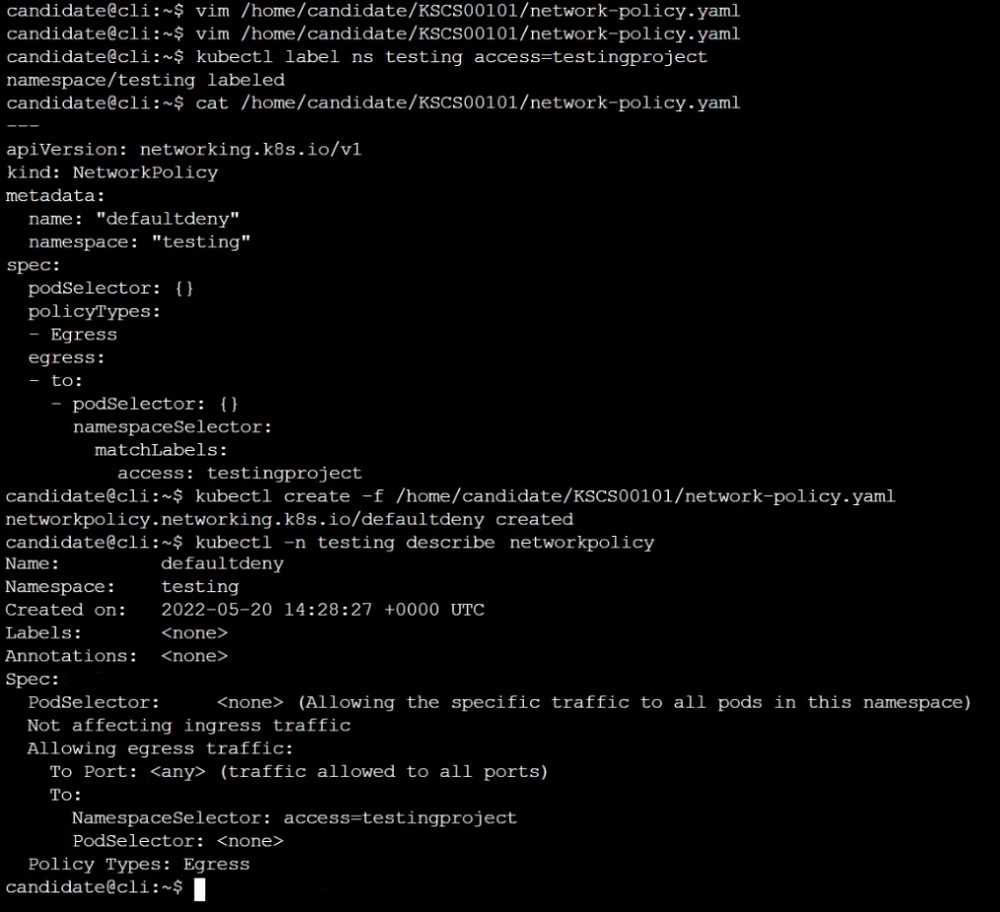 Apply the newly created default-deny NetworkPolicy to all Pods running in namespace testing.