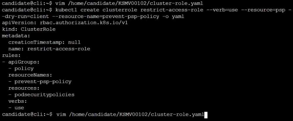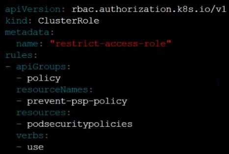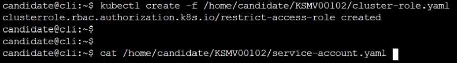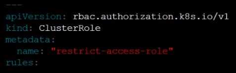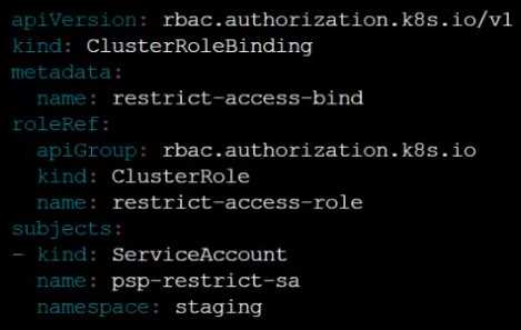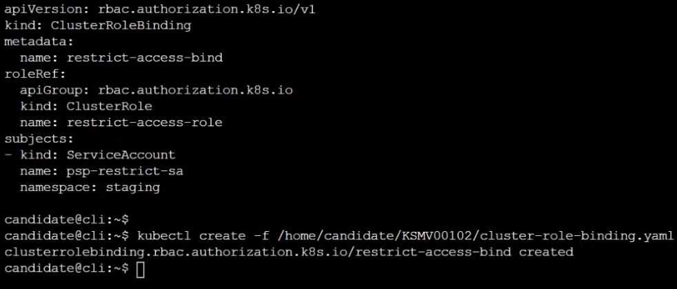 Finally, create a new ClusterRoleBinding named restrict-access-bind, which binds the newly created