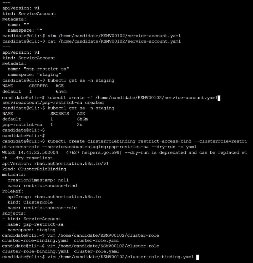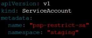 Create a new ServiceAccount named psp-restrict-sa in the existing namespace staging.