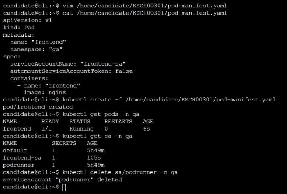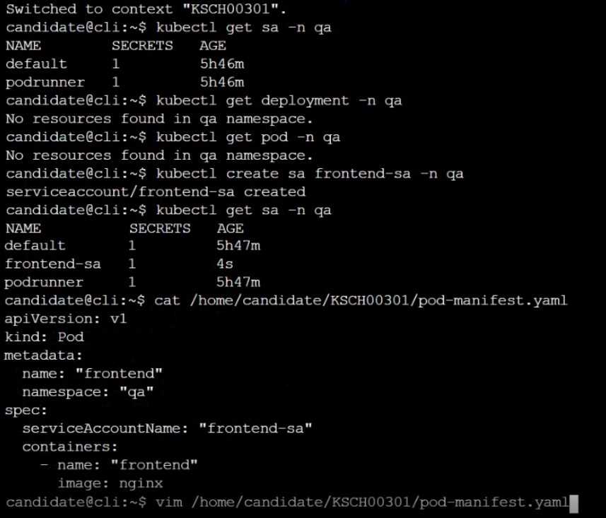 1. Create a new ServiceAccount named frontend-sa in the existing namespace q