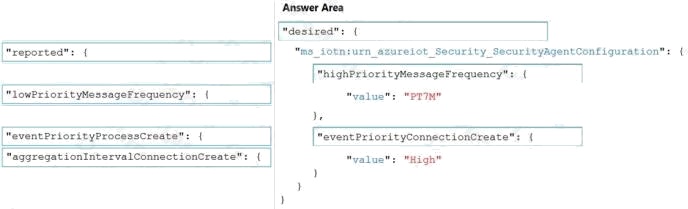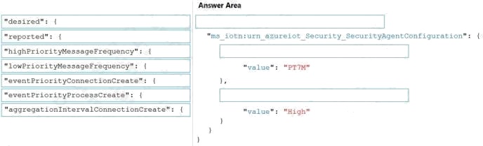 How should you configure the azureiotsecurity module twin? To answer, drag the appropriate values to the correct locations.