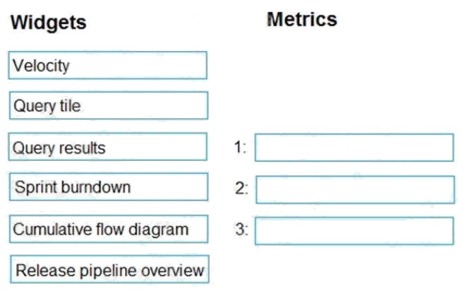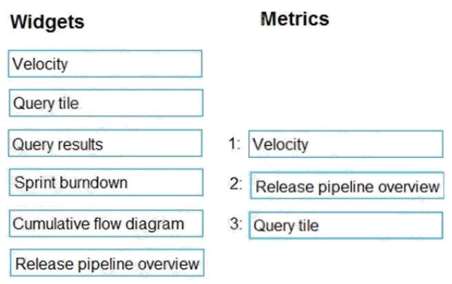 Which widget should you use for each metric? To answer, drag the appropriate widgets to the correct metrics. Each widget