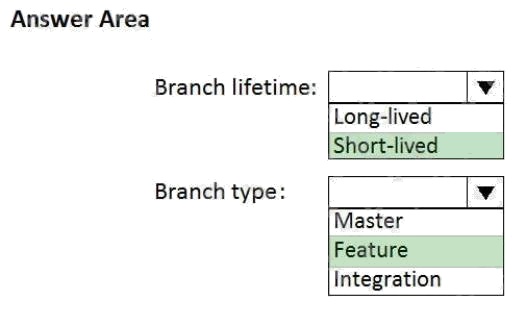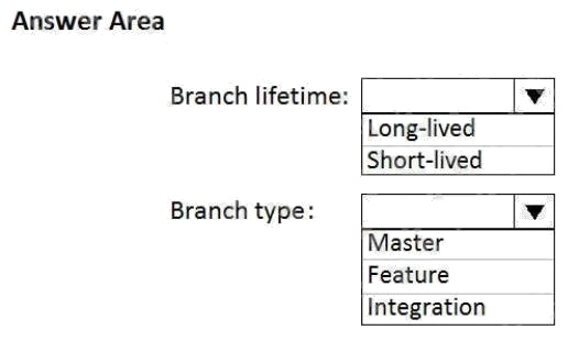 Which branch lifetime and branch time should you use in the branching model? To answer, select the appropriate options in