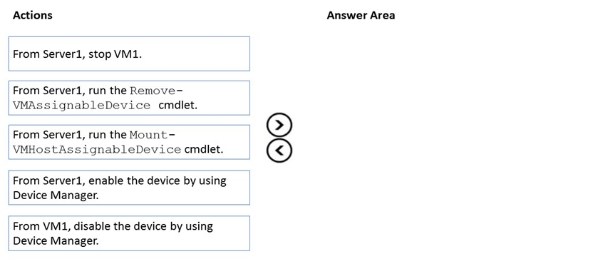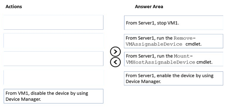 DRAG DROP You have a server named Server1 that runs Windows Server and has the Hyper V server role installed. Server1 hosts a virtual machine named VM1.