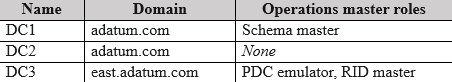The forest contains two domains named adatum.com and east.adatum.com and the domain controllers shown in the following table.