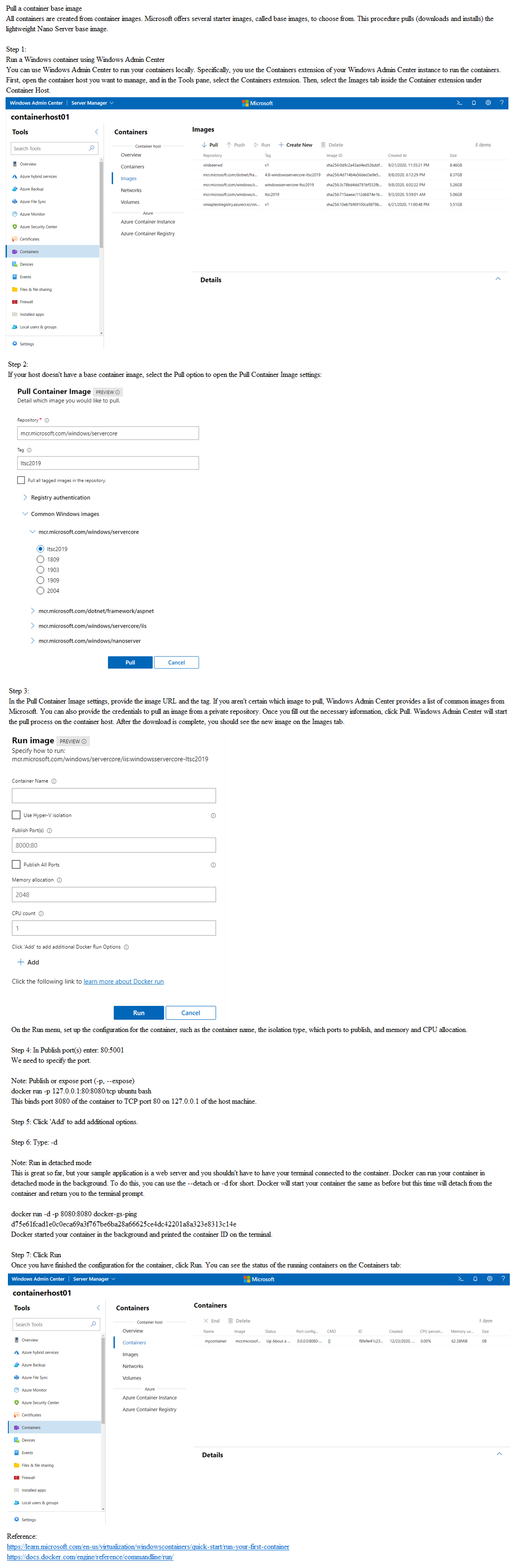 You need to run a container that uses the mcr.microsoft.com/windows/servercore/iis image on SRV1. Port 80 on the container must be published to port 5001 on SRV1 and the container must run in the background.