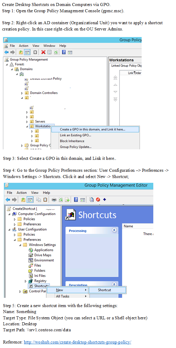 You need to configure a Group Policy preference to ensure that users in the organizational unit (OU) named Server Admins have a shortcut to a folder named \\srv1.contoso.com\data on their desktop when they sign in to the computers in the domain.