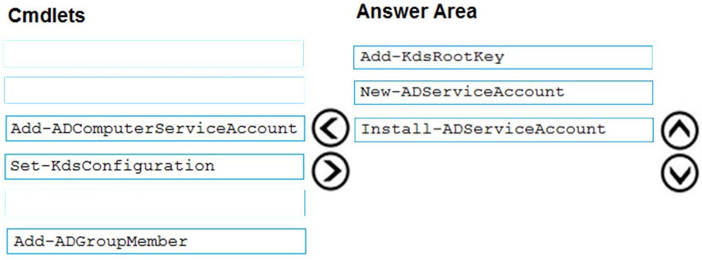 Which three PowerShell cmdlets should you run in sequence? To answer, move the appropriate cmdlets from the list of cmdlets to the answer area and arrange them in the correct order.