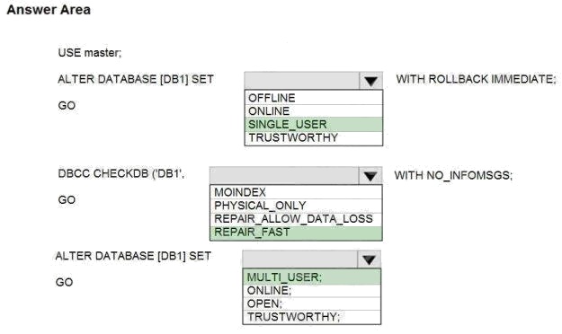 Box 1: SINGLE_USER The specified database must be in single-user mode to use one of the following repair options.