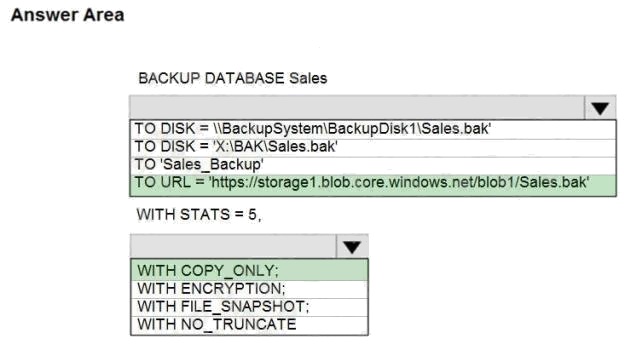 Box 1: TO URL = 'https://storage1.blob.core.windows.net/blob1/Sales.bak' Native database backup in Azure SQL Managed