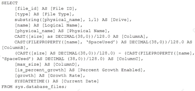 Free space for the file in the below query result set will be returned by the FreeSpaceMB column.