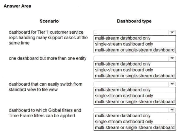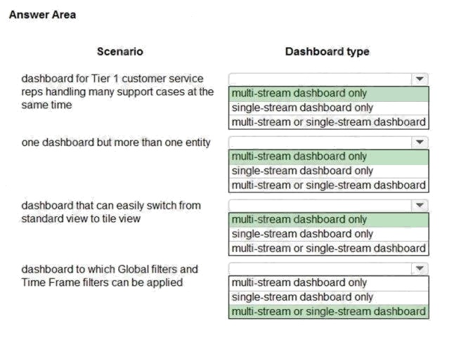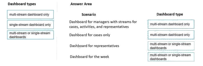 Which dashboard type should you use? To answer, select the appropriate options in the answer area.