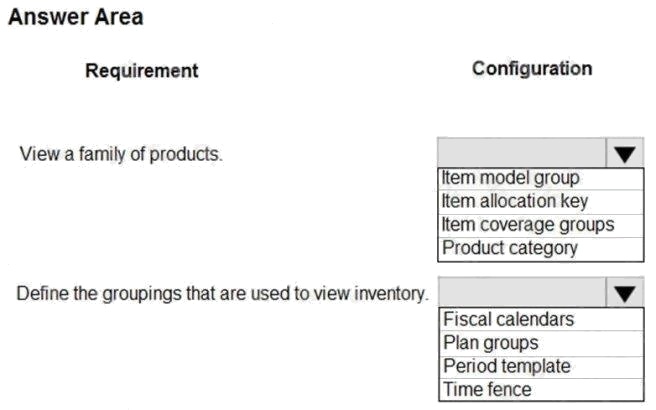 HOTSPOT A company uses Dynamics 365 Supply Chain Management for inventory management in a single warehouse. The warehouse is experiencing vendor supply issues with several specific groups of products. The demand and supply for products needs to be viewed for the warehouse using a master planning model for different periods of time. You need to view the information in a single location. Which configuration should you use for each requirement? To answer, select the appropriate options in the answer area. NOTE: Each correct selection is worth one point. Hot Area: