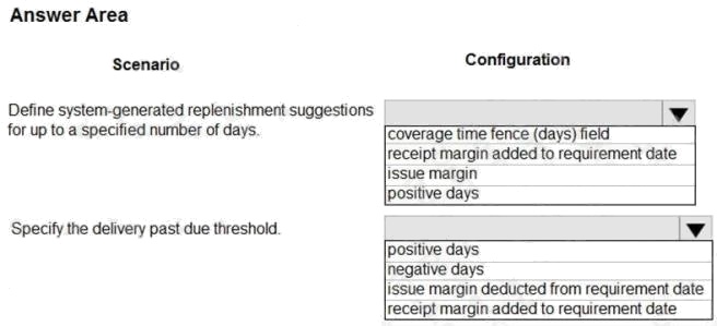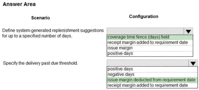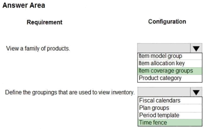 HOTSPOT A client uses master planning in Dynamics 365 Supply Chain Management. The client wants to make sure that the item coverage groups are configured properly. You need to validate the configurations. Which configurations should you validate for each scenario? To answer, select the appropriate options in the answer area. NOTE: Each correct selection is worth one point. Hot Area: