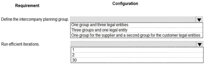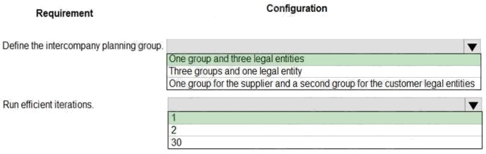 HOTSPOT A company that has three legal entities is implementing Dynamics 365 Supply Chain Management. One legal entity supplies the other two legal entities as customers with inventory. Intercompany master planning must be set up and run in the least amount of time. You need to configure the system to meet the requirements. What should you configure? To answer, select the appropriate options in the answer area. NOTE: Each correct selection is worth one point. Hot Area: