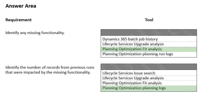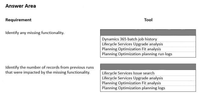 HOTSPOT A manufacturing company uses Dynamics 365 Supply Chain Management. The company plans to move to the new Planning Optimization functionality. Several processes are no longer operating as expected. You need to identify any missing functionality and the number of records impacted. Which tool should you use? To answer, select the appropriate options in the answer area. NOTE: Each correct selection is worth one point. Hot Area: