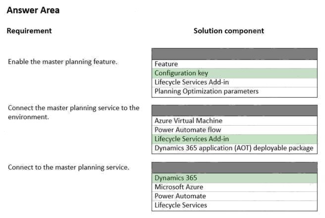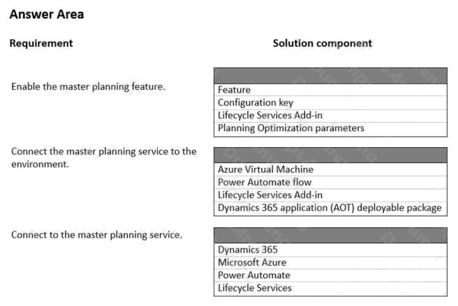 HOTSPOT The company plans to implement master planning. You need to configure the master planning solution to perform master planning runs in the middle of each day instead of at the end of each day. Which solution component should you use? To answer, select the appropriate options in the answer area. NOTE: Each correct selection is worth one point. Hot Area: