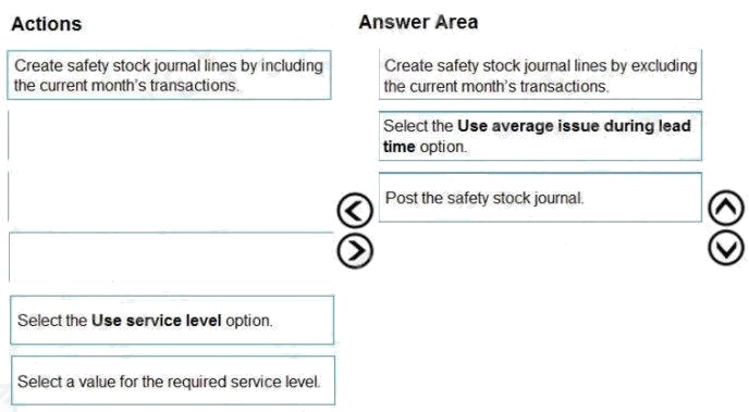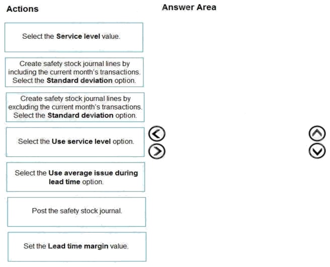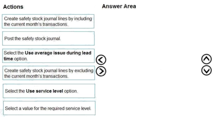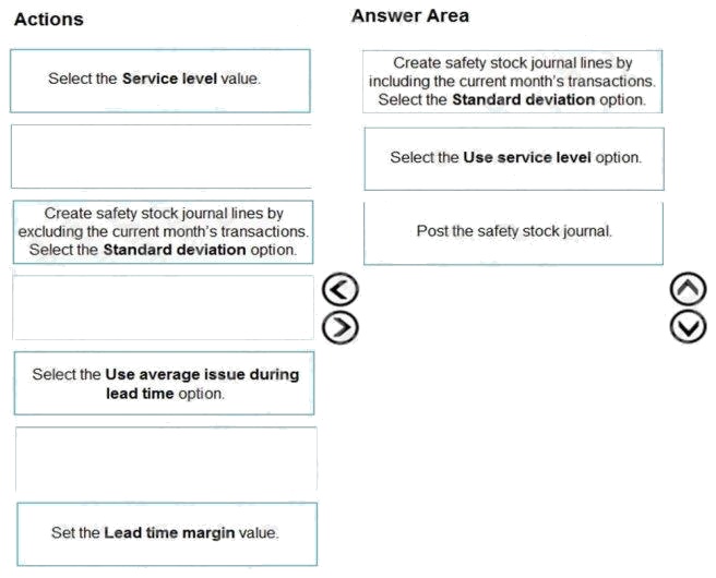 DRAG DROP A manufacturing company uses Dynamics 365 Supply Chain Management. You must review the safety stock level for raw materials. You need to calculate the minimum coverage proposals based on standard deviation. Which three actions should you perform in sequence? To answer, move the appropriate actions from the list of actions to the answer area and arrange them in the correct order. Select and Place: