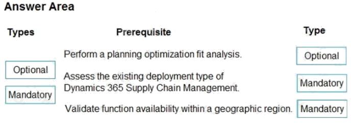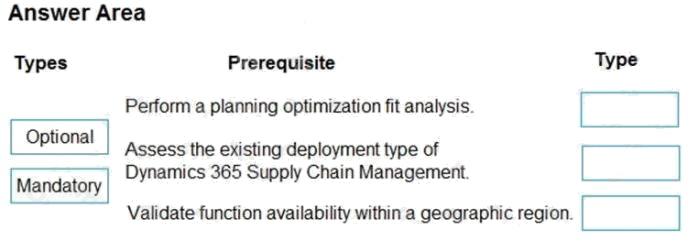 DRAG DROP A company uses Dynamics 365 Supply Chain Management with master planning. The company needs to enable planning optimization functionality to improve master planning processes. You need to advise which prerequisites the company must fulfill to enable planning optimization. What must the company do? To answer, drag the appropriate types to the correct prerequisites. Each type may be used once, or not at all. You may need to drag the split bar between panes or scroll to view content. NOTE: Each correct selection is worth one point. Select and Place: