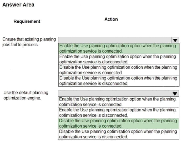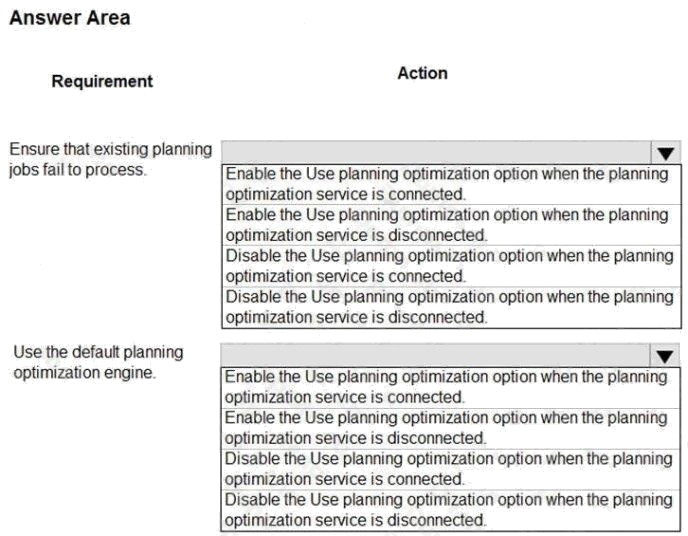 HOTSPOT A company implements Dynamics 365 Supply Chain Management. You complete the prerequisites to implement the master planning optimization. You need to configure the planning optimization feature. What should you do? To answer, select the appropriate options in the answer area. NOTE: Each correct selection is worth one point. Hot Area: