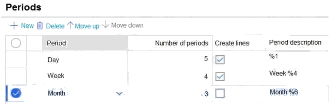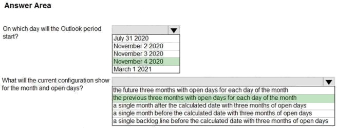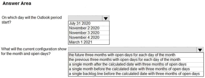 HOTSPOT You are configuring the period templates that are used for inventory inquiries. Todays date is November 3, 2020. The period templates configuration is shown in the following graphic. You set the value for the Direction field to backward. Use the drop-down menus to select the answer choice that answers each question based on the information presented in the graphic. NOTE: Each correct selection is worth one point. Hot Area: