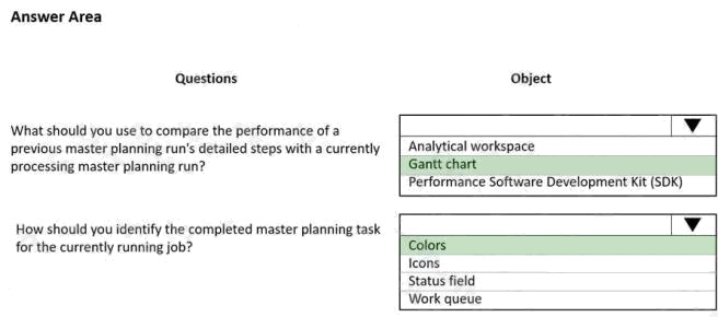HOTSPOT A company uses Dynamics 365 Supply Chain Management for master planning in manufacturing processes. Master planning runs have increased in processing time over the past month. You need to identify the impact of configuration changes on performance from a single location. Which objects should you use? To answer, select the appropriate options in the answer area. NOTE: Each correct selection is worth one point. Hot Area: