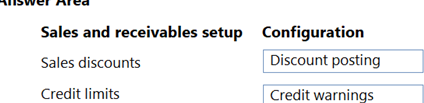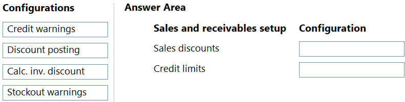What should you configure for each setup area? To answer, drag the appropriate configurations to the correct sales and receivables setup. Each configuration may be used once, more than once, or not at all. You may need to drag the split bar between panes or scroll to view content.