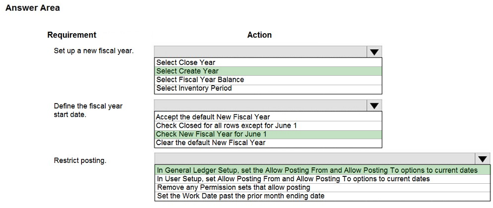HOTSPOT You need to set up a new fiscal year and restrict posting for all users to the current fiscal year.