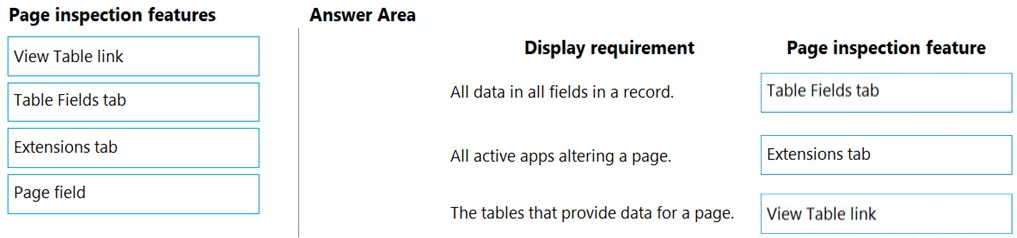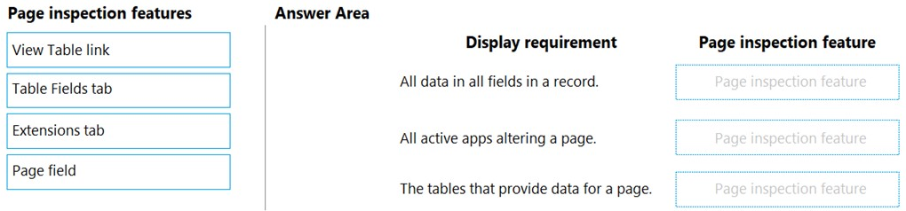 Which features should you use? To answer, drag the appropriate page inspection features to the correct display requirements. Each page inspection feature may be used once, more than once, or not at all. You may need to drag the split bar between panes or scroll to view content.