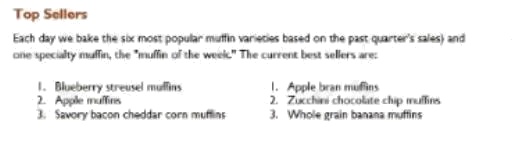 Explanation: : On the Home tab, in the Clipboard group, click Copy Formatting. Select the paragraph(s) where you want to replace the formatting. On the Home tab, in the Clipboard group, click Paste, or use the keyboard shortcut Ctrl+V. Topic 5, Perfect MuffinsFourth Coffee uses muffin recipes that were created for our exclusive use by the Culinary School at Bellows College. The recipe ingredients differ, but all the muffins are produced by using the same method.