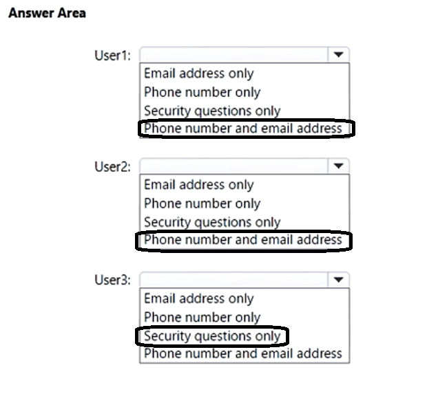 user1: phone number and email address - user2: phone number and email address - user3:security questions only