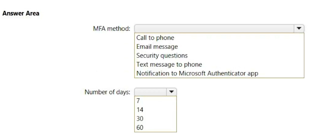 Which multi-factor authentication (MFA) method can the user use, and how many days does the user have to register for MFA? To answer, select the appropriate options in the answer area.