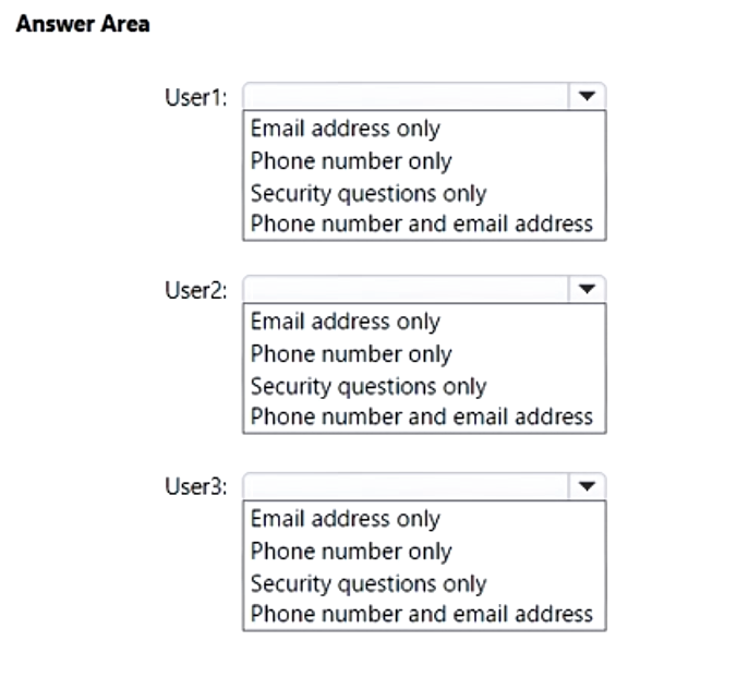 user1: phone number and email address - user2: phone number and email address - user3:security questions only