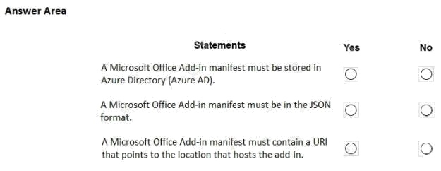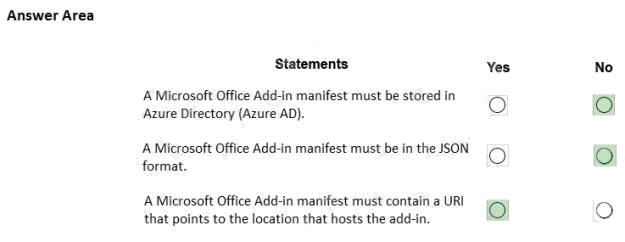 References: https://docs.microsoft.com/en-us/office/dev/add-ins/develop/add-in-manifests https://docs.microsoft.com/en-