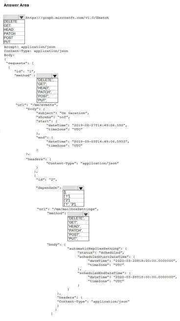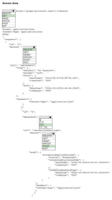 How should you complete the batch request? To answer, select the appropriate options in the answer area.