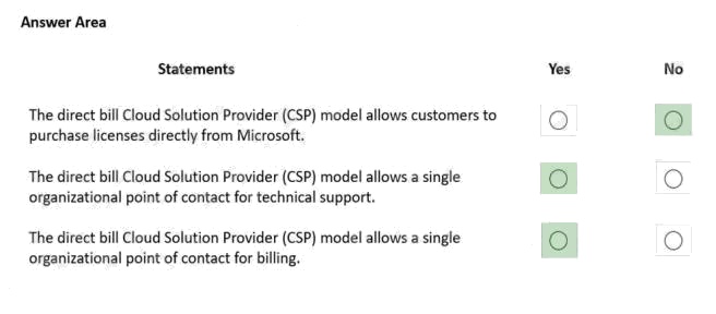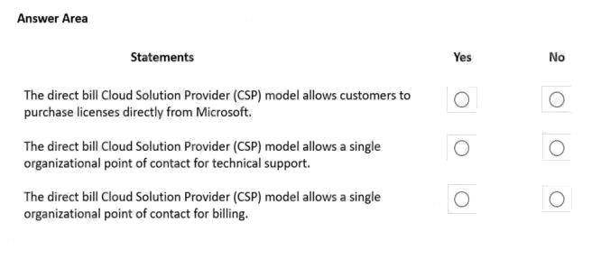 The statements provided describe aspects of the direct bill Cloud Solution Provider (CSP) model. The first statement indicates that customers can purchase licenses directly from Microsoft, which is true as the direct bill model enables this. The second statement mentions a single organizational point of contact for technical support, which is also accurate, as the CSP acts as the primary support contact for the customer. Finally, the third statement asserts that there is a single organizational point of contact for billing, which is correct as well, as the CSP manages billing directly with the customer.