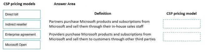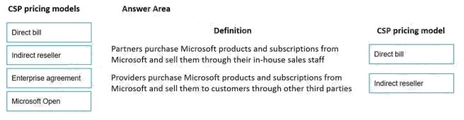 Instructions: To answer, drag the appropriate CSP pricing model from the column on the left to the definition on the right.