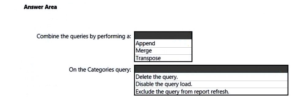 How should you combine the queries, and what should you do on the Categories query? To answer, select the appropriate options in the answer area.