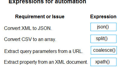 Which expressions should you use to address the requirements and issues? To answer, move the appropriate expression to the correct requirement or issue. You may use each expression once, more than once, or not at all. You may need to move the split bar between panes or scroll to view content.