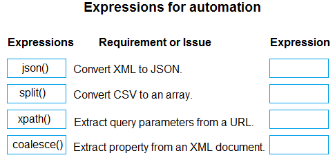Which expressions should you use to address the requirements and issues? To answer, move the appropriate expression to the correct requirement or issue. You may use each expression once, more than once, or not at all. You may need to move the split bar between panes or scroll to view content.