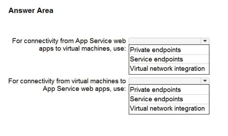 HOTSPOT You need to recommend a strategy for App Service web app connectivity. The solution must meet the landing zone requirements.