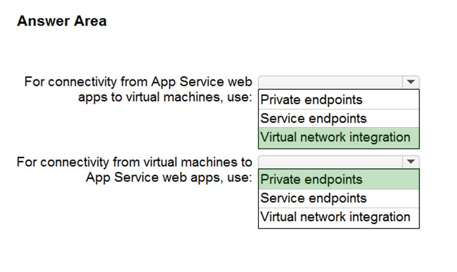 Ensure that the Azure virtual machines in each landing zone communicate with Azure App Service web apps in the same zone over the Microsoft backbone network, rather than over public endpoints.