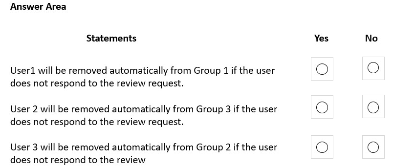 The access review applies to Group3, but not to Group1. The access review is setup to remove access if reviewers don't respond.