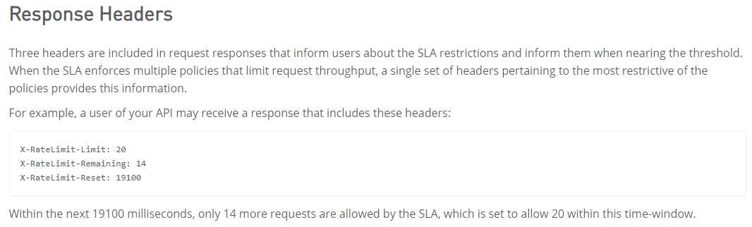 An API implementation returns three X-RateLimit-* HTTP response headers to a requesting API