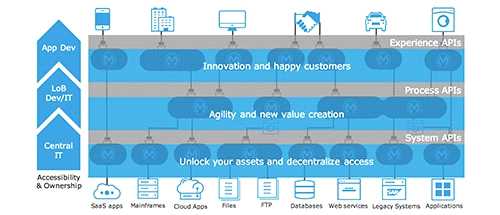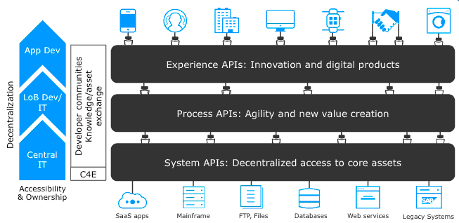 API-led connectivity is a 3-layered architecture covering Experience, Process and System layers