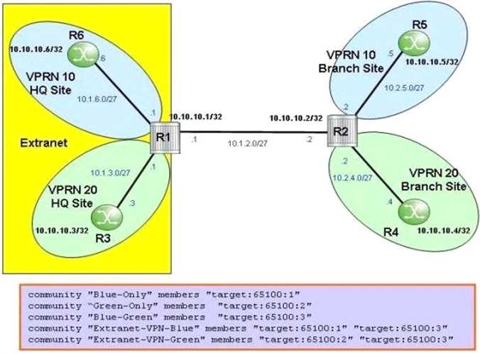 The headquarter sites of VPRN 10 and VPRN 20 are part of an extranet VPRN. Which route target(s) should be imported under the VPRN 10 service on router R1?