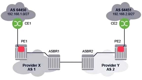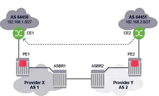 For the Inter-AS model В VPRN, which of the following is FALSE when CE2 sends an IP packet to 192.168.1.1?